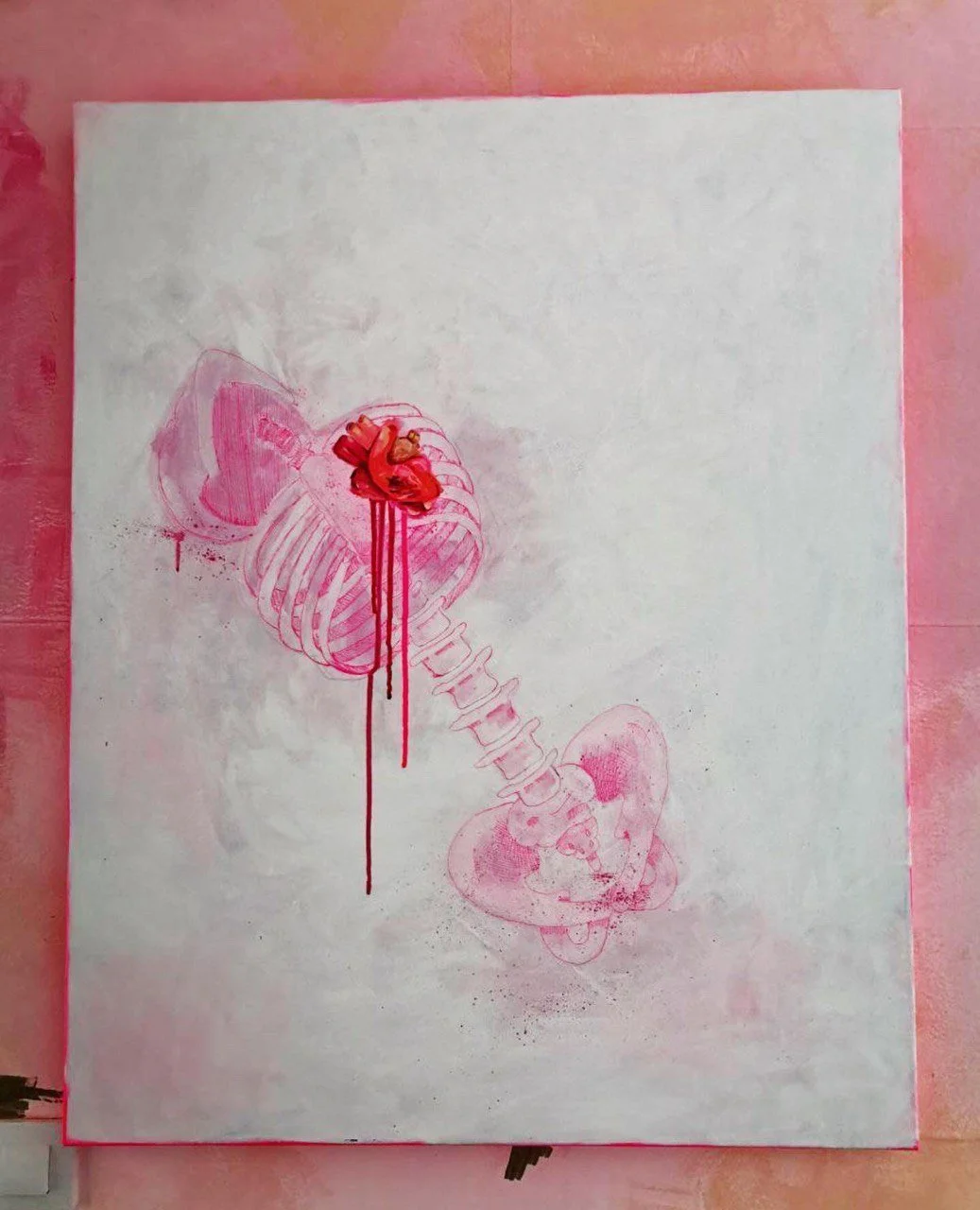 Este cuadro lo pinté hace casi tres años y me sigue representando, soy esqueleto y corazón, mis sentimientos sangran, pero son de color rosa.